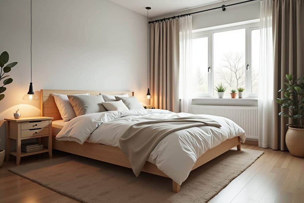 Verleihe deinem Palettenbett mit einer indirekten Beleuchtung eine gemütliche Atmosphäre. Du kannst LED-Streifen unter den Paletten anbringen oder Lichterketten um das Bett wickeln. Das gedämpfte Licht sorgt für eine entspannende Stimmung im Schlafzimmer.