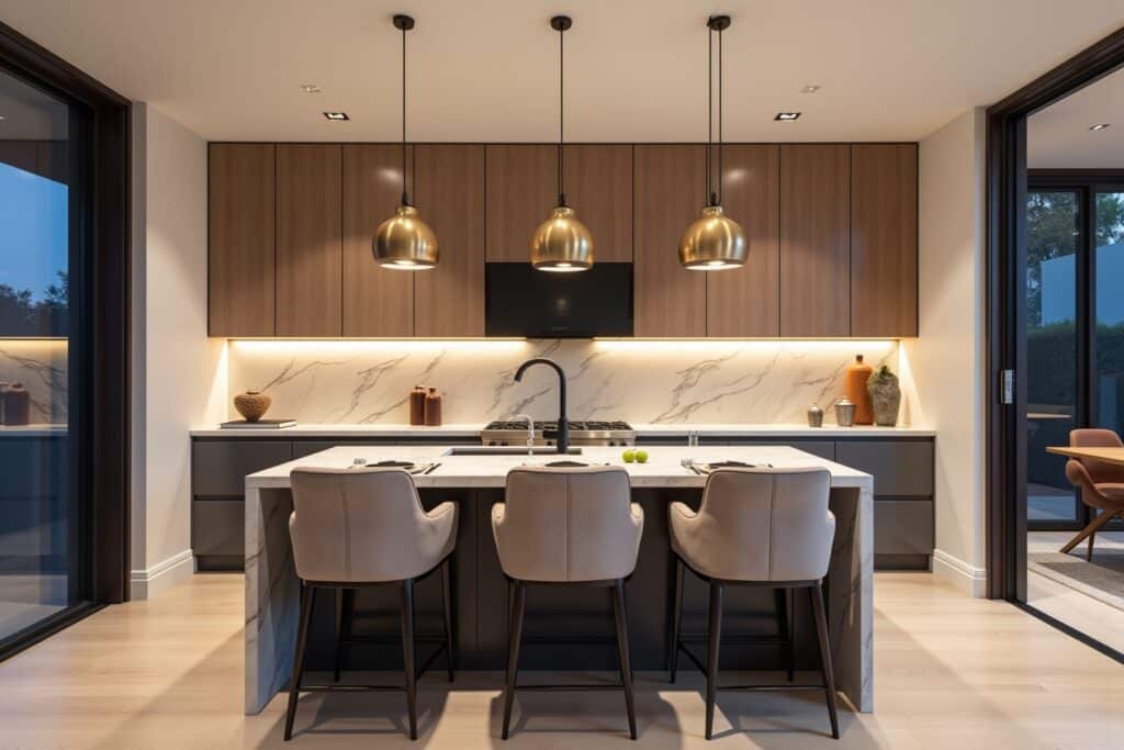 Die richtige Beleuchtung ist entscheidend für die Atmosphäre in deiner Küche. Über der Theke sollten Hängeleuchten angebracht werden, die das Licht gezielt auf die Arbeitsfläche lenken und gleichzeitig für eine angenehme Beleuchtung sorgen. Dimmbare Leuchten ermöglichen es dir, die Helligkeit je nach Bedarf anzupassen. Zusätzlich können indirekte Lichtquellen wie LED-Streifen unterhalb der Theke oder in den Schränken für eine stimmungsvolle Beleuchtung sorgen.