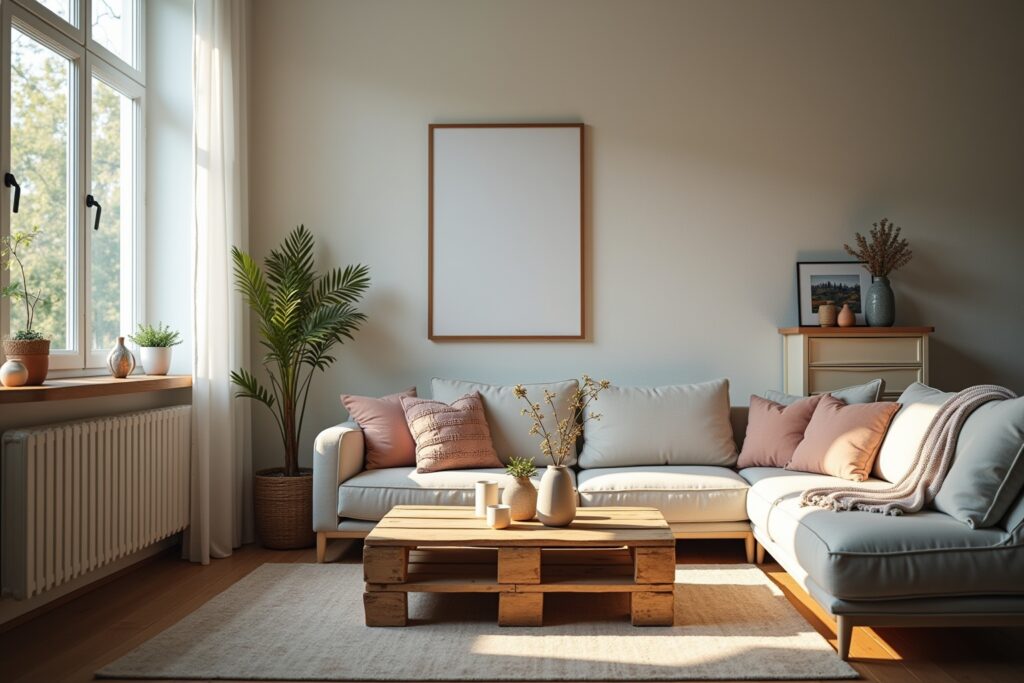 - Palettenmöbel: Europaletten sind ein vielseitiges Material für das Upcycling von Wohnzimmermöbeln. Aus ihnen lassen sich Couchtische, Sitzgelegenheiten oder sogar modulare Sofas bauen. Mit Polstern und Kissen wird die rustikale Optik ergänzt.