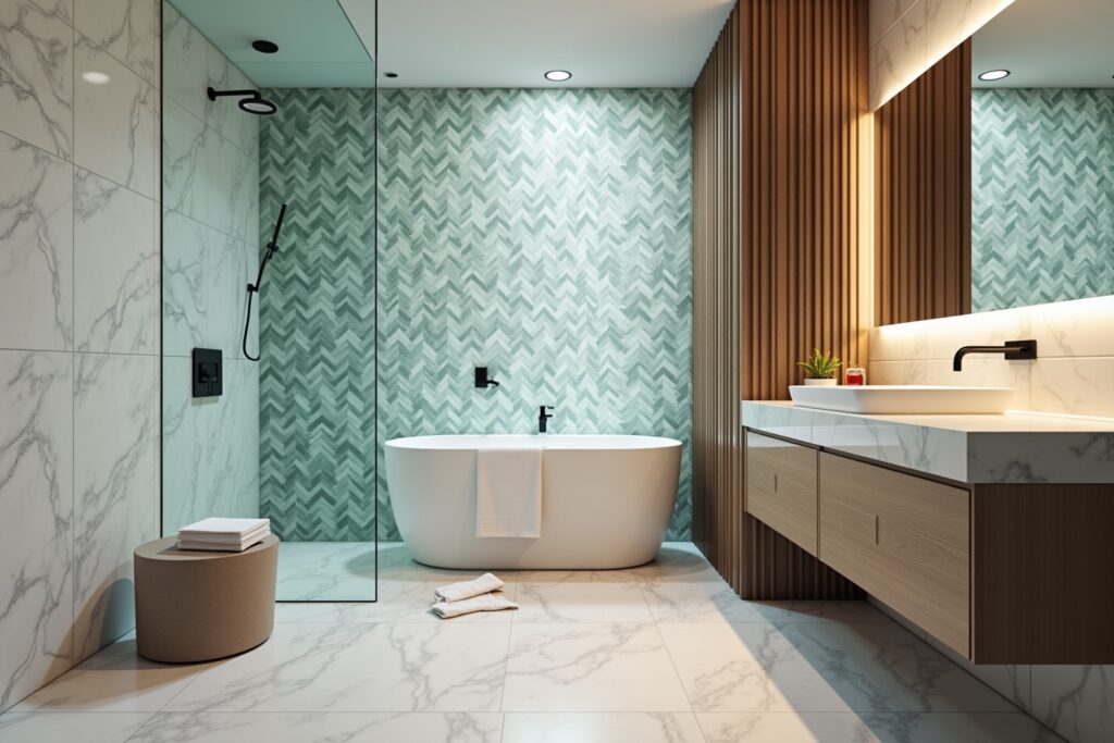 Klare Linien und strukturierte Muster sind im Trend und bringen eine moderne Ästhetik in Bäder und Küchen. Ob feine Rauten, Hexagone, Streifen oder abstrakte geometrische Formen – diese Designs wirken oft beruhigend und aufgeräumt. Besonders in kleineren Räumen können dezente geometrische Muster Weite schaffen.
